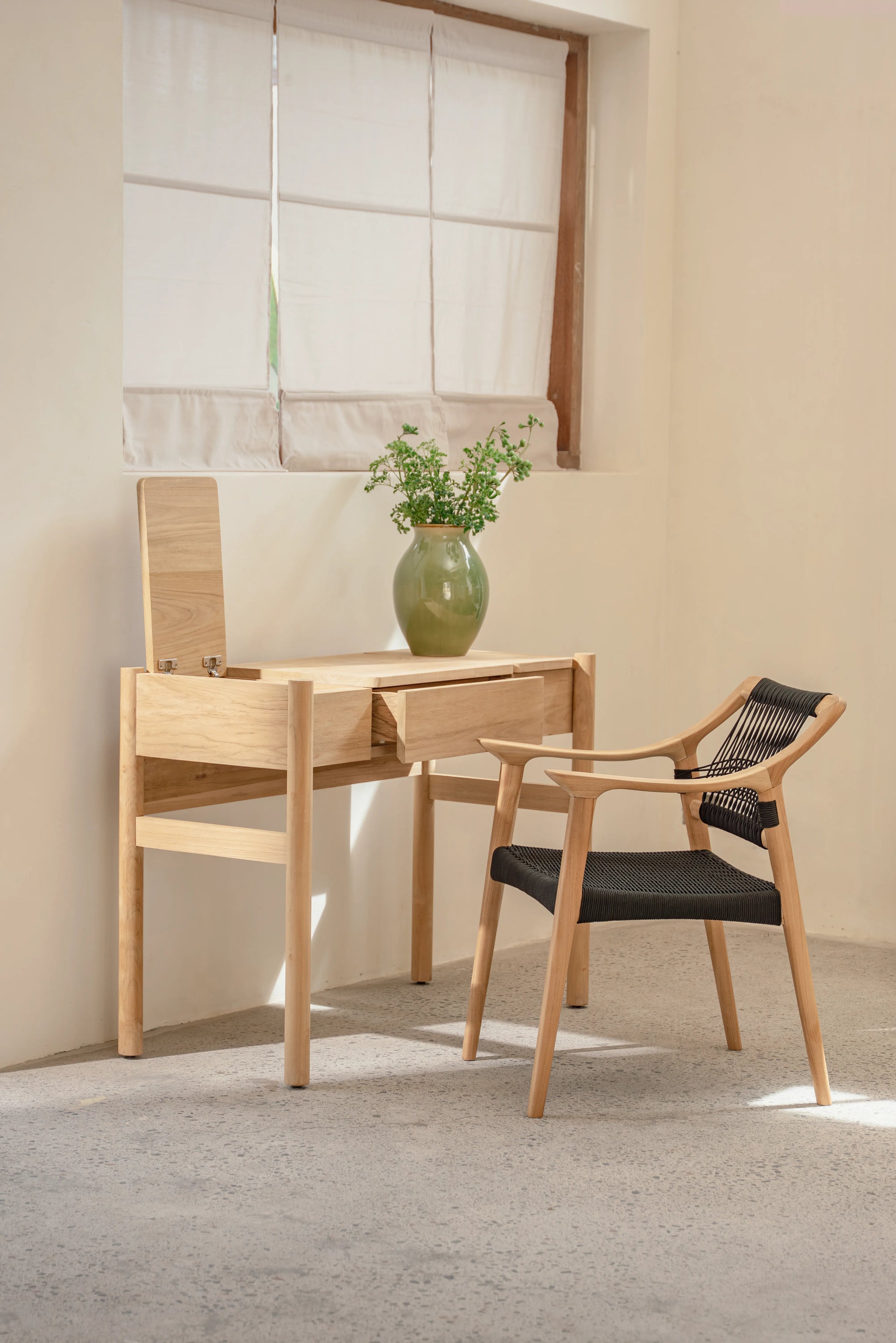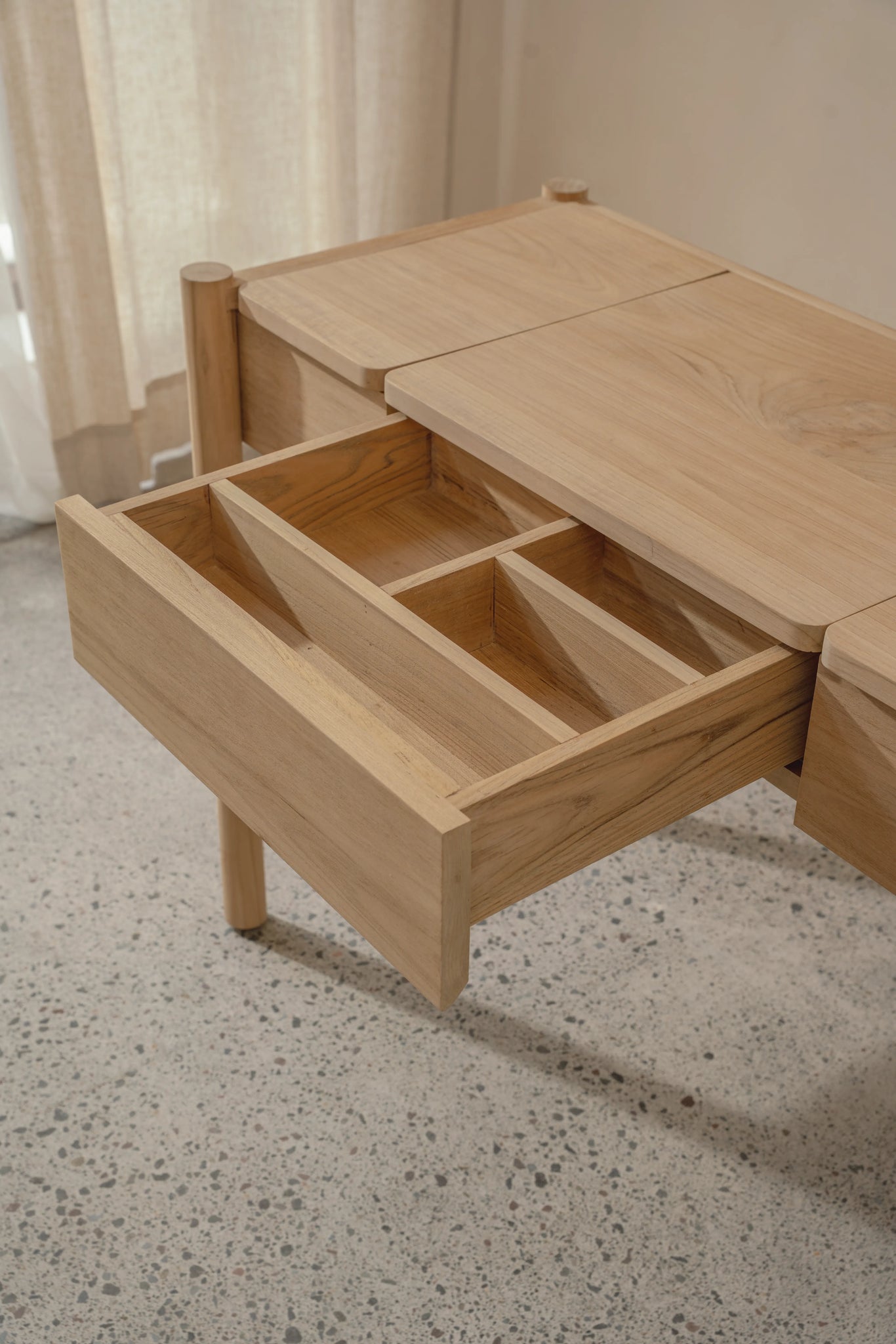 The Putri Vanity is a dedicated space for morning rituals. It trades the delicate for the durable, featuring a weighted, solid teak frame that brings a raw, forest-inspired energy into the bedroom. Part of our made-to-order collection, the Putri can take on a variety of shapes and forms to meet your needs.